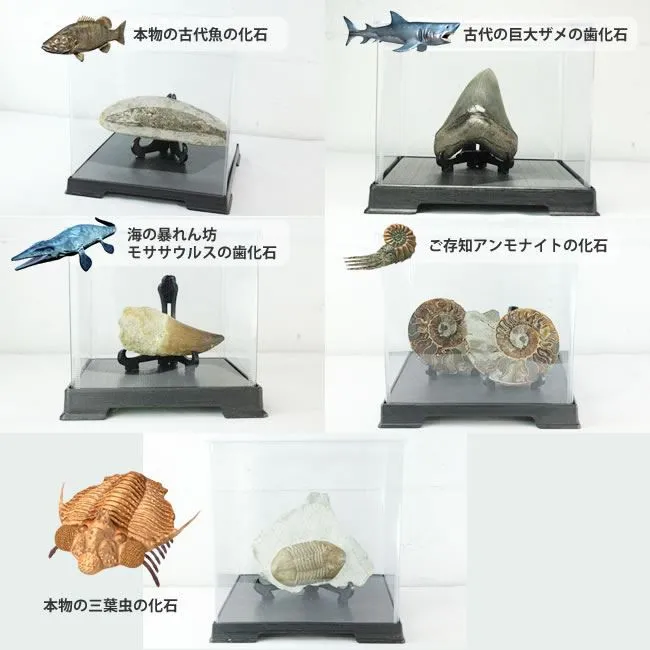 バラエティーに富んだ5つの本物化石を並べて、ミニ博物館を開催します。ご提供するのは本物の有名化石ばかり。学校の教科書にも載っている、よく知られた生物の化石を、様々な時代からセレクションしました。間近で本物化石を見る機会を演出します。興味を惹く楽しい説明パネル付きで老若男女が楽しめます。ケース等すべて付属していて準備いらず!簡単設置も魅力です。
