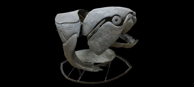 ダンクルオステウスは板皮類(はんぴるい)類という、頭部が異様に発達した鎧のような骨で覆われています。頭部以外は、通常の魚と同じく肉やウロコでできています。したがって、化石として残るのは、頭部だけです。板皮類(はんぴるい)類は古生代の石炭紀には絶滅し、現在そのような魚類は存在しません。